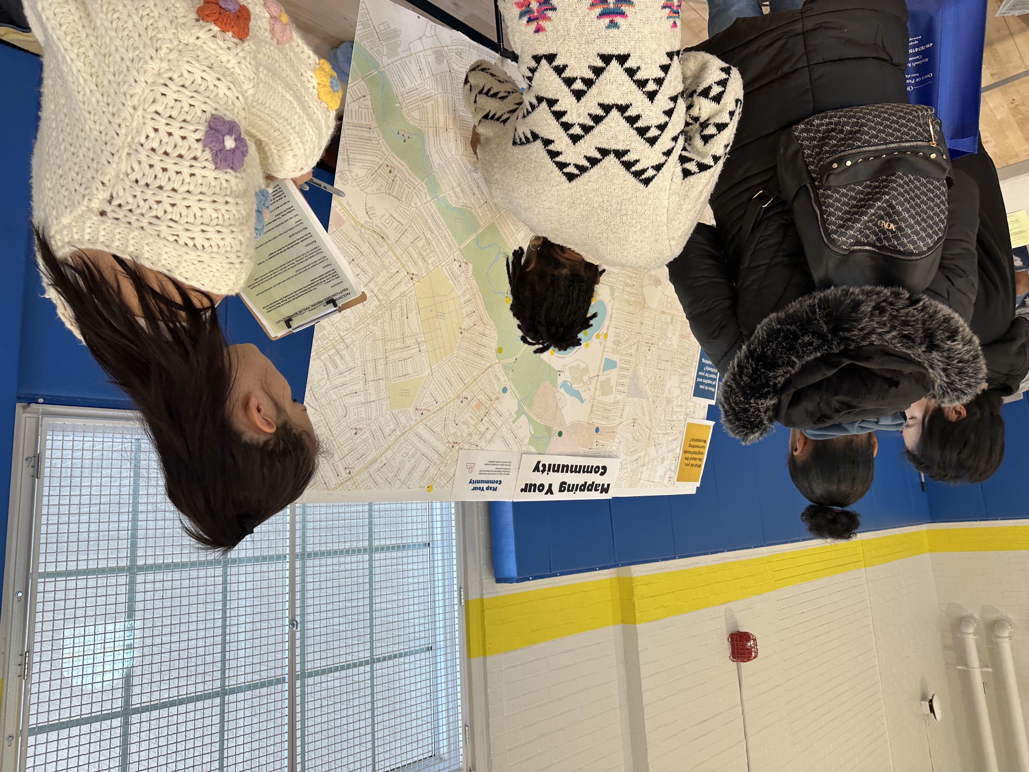 Purpose: The mapping activity allowed parents/caregivers to see their neighborhood on a larger scale and mark their responses on the map with a green, blue, or yellow sticker corresponding to the question.